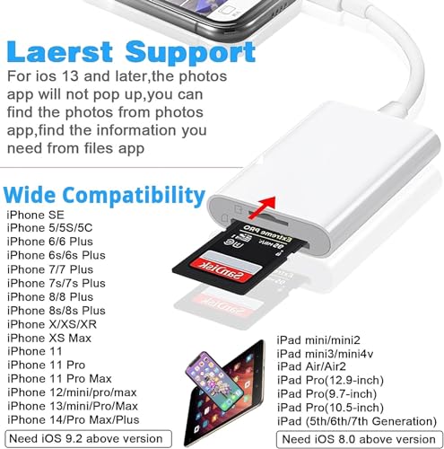 - توافق واسع: قارئ بطاقات اس دي ايفون متوافق مع ايفون 14 / 13 / 13 ميني / 13 برو / 13 برو ماكس / 12 / 12 ميني / 12 برو / 12 برو ماكس / 11 / 11 برو / اكس اس / اكس اس ماكس / اكس ار / 8/8 بلس / 7/7 بلس / 6 اس / 6 اس بلس / 6/6 بالإضافة إلى / SE و SE و ايباد اير/ ميني/ برو، إلخ.