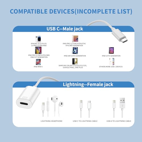 - خاصية التوصيل والتشغيل: لا حاجة إلى برامج تشغيل أو برامج إضافية. قم بتوصيل طرف المحول USB-C بمنفذ USB-C على جهاز آيفون 15 أو اي باد الجديد، ثم قم بتوصيل ملحق لايتنينج الخاص بك. ستتمكن من توصيل الشاحن لشحن هاتفك الخلوي أو الاستمتاع بالموسيقى في أي وقت وفي أي مكان وتوفير المال عن طريق شراء محول.
