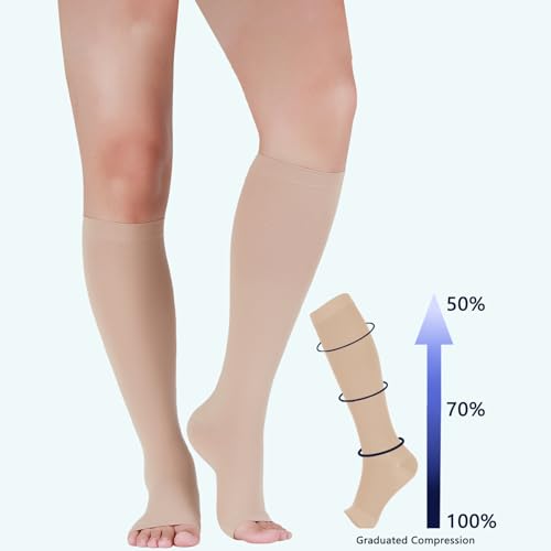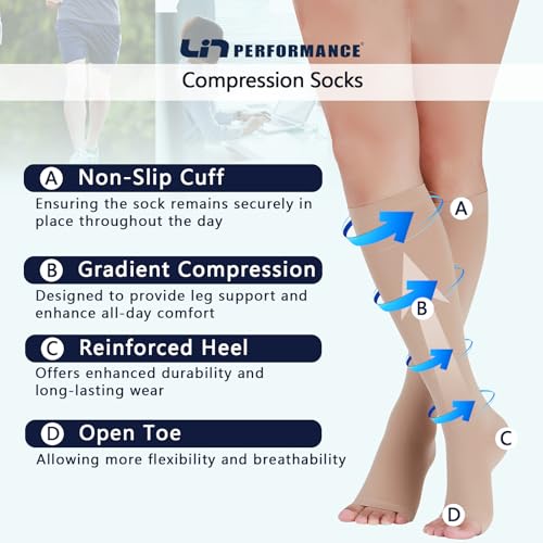 LIN PERFORMANCE - شراب ضاغط للنساء والرجال، شراب طويل مفتوح عند الأصابع مناسب للدوالي وتورم الساقين من لين بيرفورمانس، مع ضغط يتراوح بين 20 إلى 30 ملم زئبقي