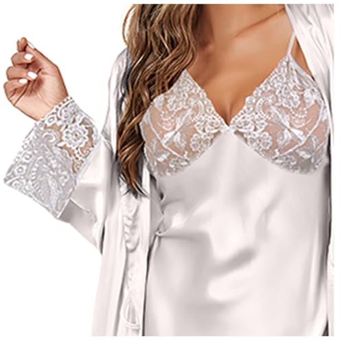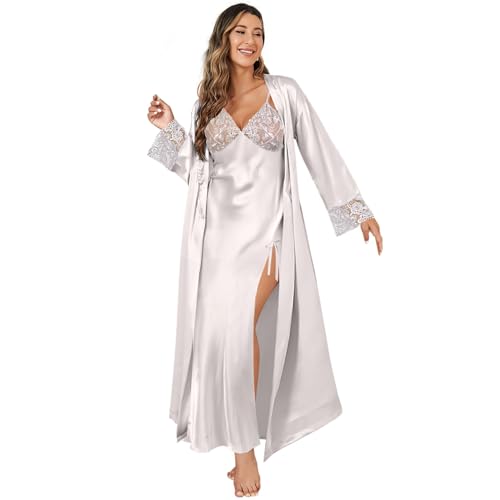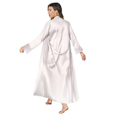 Linclere - طقم لانجيري من الساتان مكون من قطعتين (روب بأكمام طويلة وفستان لانجيري طويل) للنساء من لينكلير، لون كريمي، مقاس اكس اكس لارج