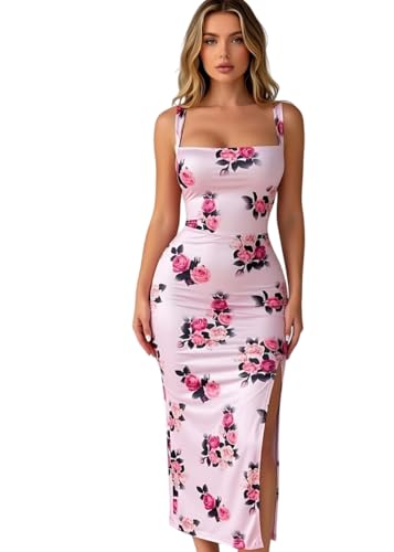 Generic - لانجري دريس ليكرا جيل طويل حمالات بفتحة جانبية بنقشة زهور ( وان سايز يلبس لحد 85 كيلو )