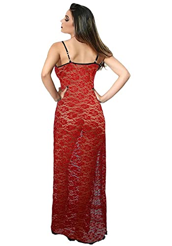 Generic - لانجيري قميص نوم طويل من الدانتيل مفتوح من الامام ومزين بفستون اسود