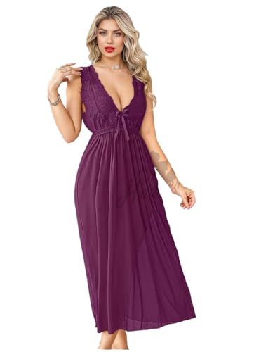 GAMAL SONS FOR ABAYA - قميص لانجري طويل من الدانتيل باستك عند الصدر مقاس واحد، ارجواني من جمال صنز للعباية، GS-502-51287 - ارجواني