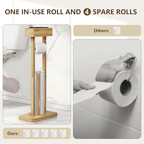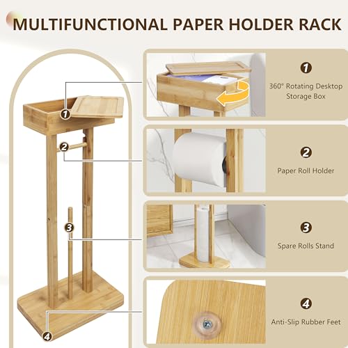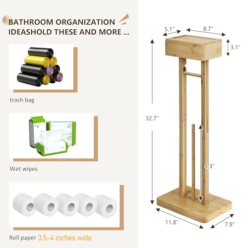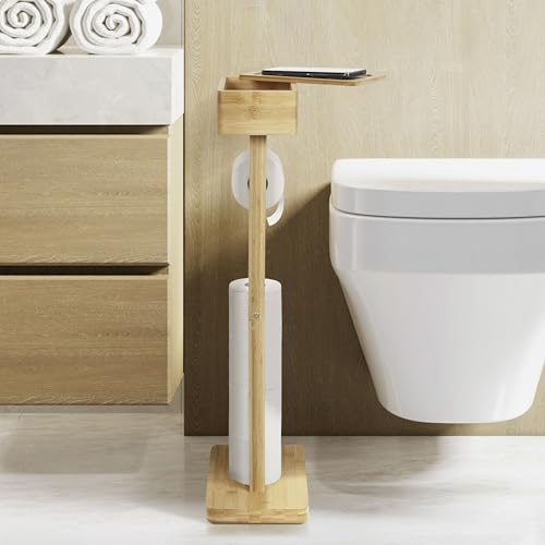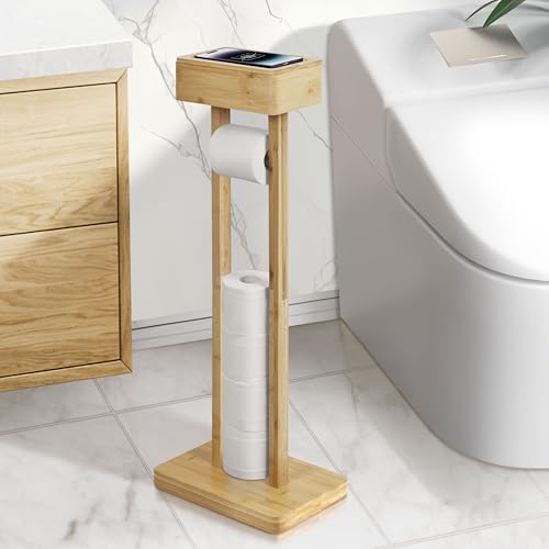 LINKLIFE - حامل ورق تواليت من لينك لايف، 4 مميزات في عنصر واحد، مصنوع من الخيزران، ومزود بمساحة لتخزين المناديل لتنسيق وتنظيم الحمّام — لون طبيعي