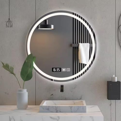 Lion Home - مراية حائط ليد ذكية تعمل باللمس مضادة للضباب مع ساعة رقمية وعرض درجة الحرارة بـ 3 ألوان إضاءة قابلة للتعديل (دافئ/محايد/بارد) بتصميم عصري بدون إطار من ليون هوم، مقاس 70 × 70 سم