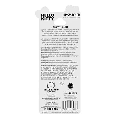 - شفاه لا تقاوم: استمتعي بالمذاق الحلو والمنعش لنكهات تنت ليب سماكر المفضلة لديك! تتميز بصديقتك الرائعة من شركة سانريو، هالو كيتي، هذا التنت متعدد الاستخدامات للشفاه والخدود يتميز بملمس جيلي مرن ممتع ينزلق بلون واضح رقيق قابل للبناء ونكهة الكرز الحلوة.