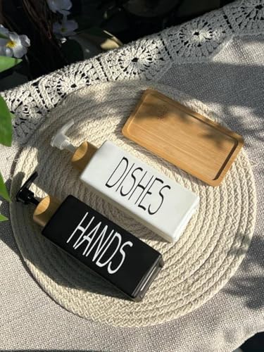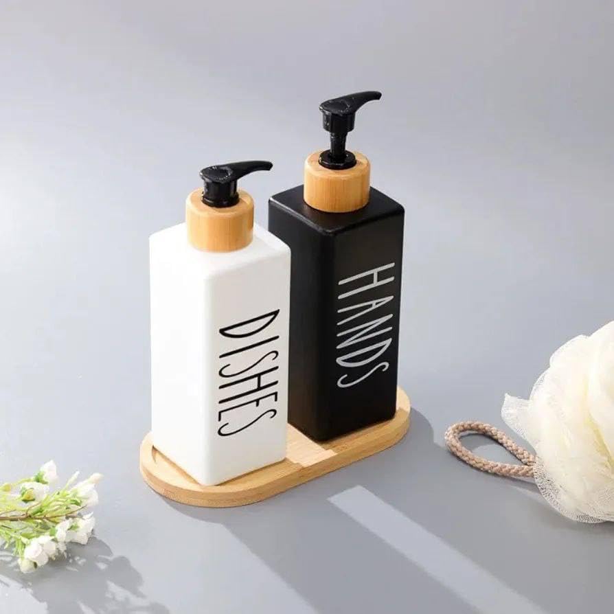 Generic - طقم موزع صابون سائل مع صينية خشبية، أسود وأبيض، مع غطاء خشب البامبو، للحمام والمطبخ