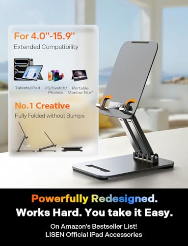 LISEN - حامل تابلت للمكتب من ليسين، مسند آي باد برو، حامل شاشة محمول قابل للطي، ملحقات السفر، إكسسوارات مكتب للمنزل والمكتب للرجال 2024 آي باد تاب كيندل آيفون 4-15.9 بوصة، أسود