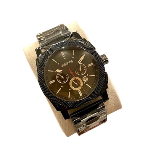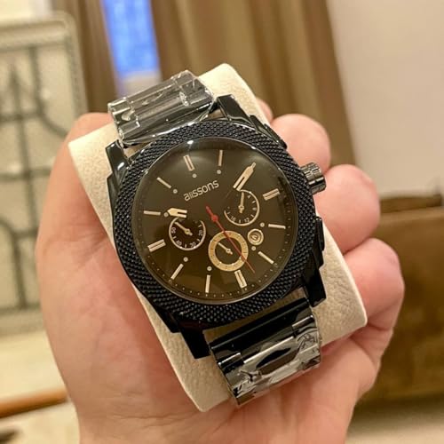 Generic - ساعة الليسونز للرجال، كرونوغراف، إطار أسود، سوار معدني، تصميم رياضي