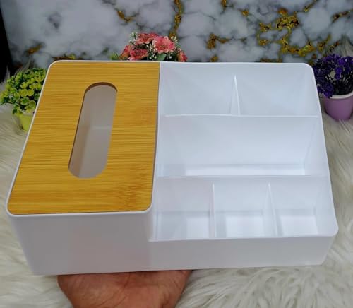 Generic - علبة مناديل لغرفة المعيشة، منظم مكياج مع علبة مناديل بلاستيكية مع غطاء من البامبو