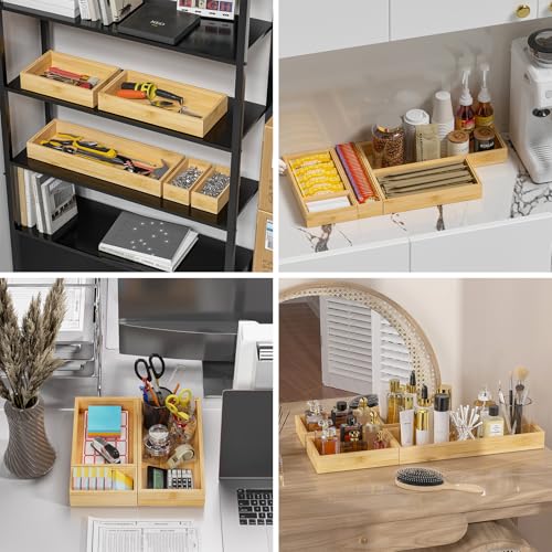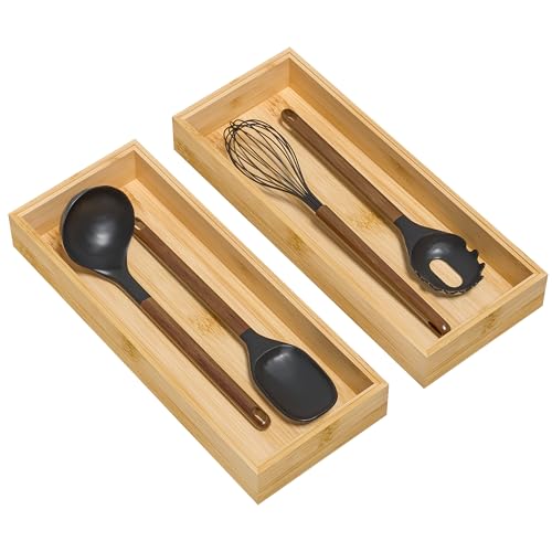 Lixple - منظم أدراج المطبخ من الخيزران ليكسبل حامل أدوات قابل للتكديس لتنظيم الأدوات الفضية صينية الطاولة - صناديق تنظيم مجوهرات المكياج وأدوات الحمام والمكتب والدواليب 38×15×5 سم قطعتين