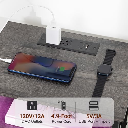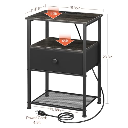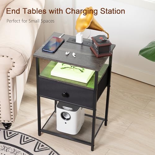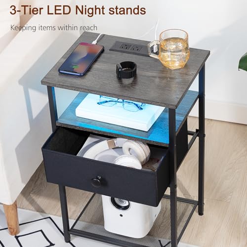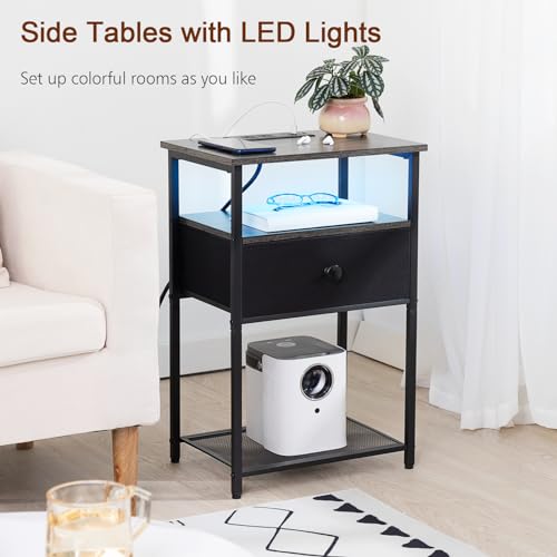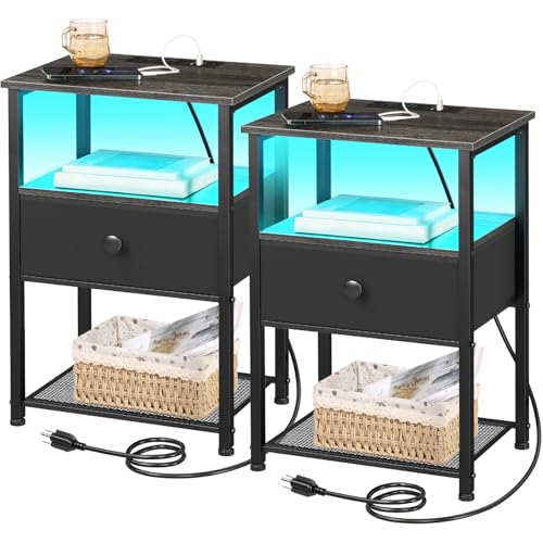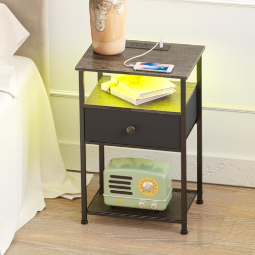 LOAKEKEL - طاولة جانبية عصرية بجانب السرير مع قاعدة شحن وإضاءة ليد مع درج ورفوف تخزين لغرفة النوم من وينفون، لون أبيض، طقم من قطعتين، حديد