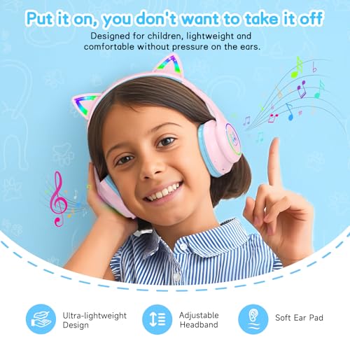 LOBKIN - سماعات رأس لاسلكية قابلة للطي فوق الأذن بتقنية البلوتوث للأطفال مع ميكروفون ووقت تشغيل 50 ساعة وإضاءة ليد ملونة وسلك ايه يو اكس بقدرة 94 ديسيبل للأولاد والبنات للسفر والمدرسة والاي باد من لوبكين