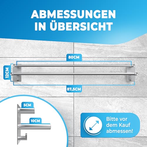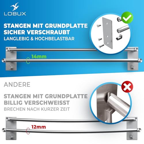 LOBUX - حامل مناشف بدون ثقب من لوبوكس® - 80 سم، ستانلس ستيل مقاوم للصدا - قضيب منشفة حمام مزدوج ذاتي اللصق - حامل منشفة حمام يتضمن خطافين للمنشفة - للحمام وشاشة الدش، فضي