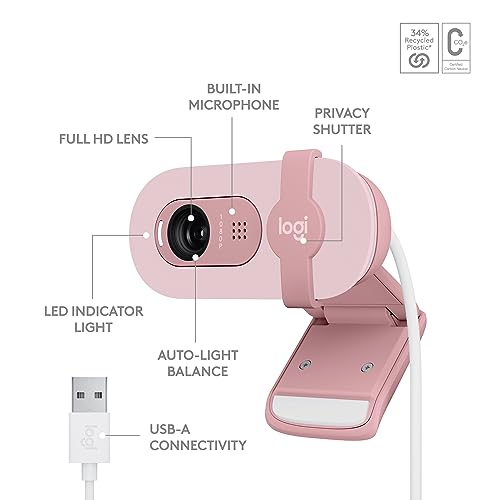 Logitech - لوجيتيك كاميرا ويب 100 FHD من بريو للاجتماعات والبث المباشر، توازن الضوء التلقائي، ميكروفون مدمج، غالق الخصوصية، USB A، لمايكروسوفت تيمز، جوجل ميت، زووم والمزيد - روز، وردي