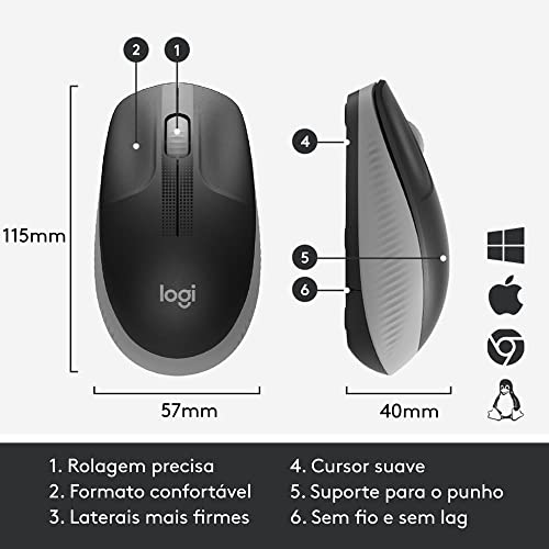 Logitech - ماوس لاسلكي لوجيتك M190 بتصميم قياسي يناسب استخدام اليدين، اتصال USB وبطارية مرفقة - رمادي