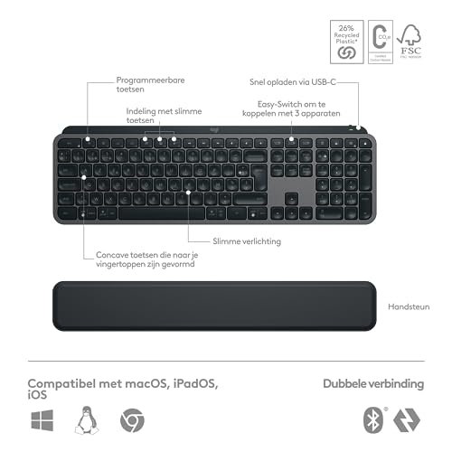 Logitech - لوحة مفاتيح وماوس لاسلكي عالي الأداء ام اكس كيز اس مع مسند لراحة اليد، إضاءة قابلة للتخصيص، تمرير سريع، بلوتوث، USB C، لويندوز ولينكس وكروم وماك، لوحة مفاتيح نوع كويرتي بريطاني من لوجيتيك، جرافيت