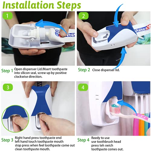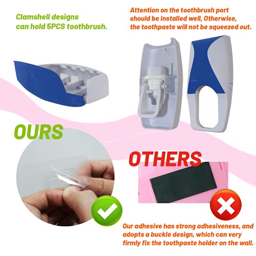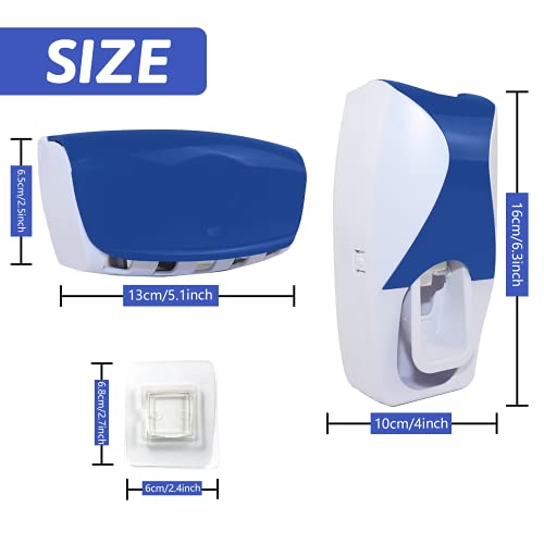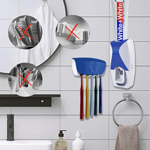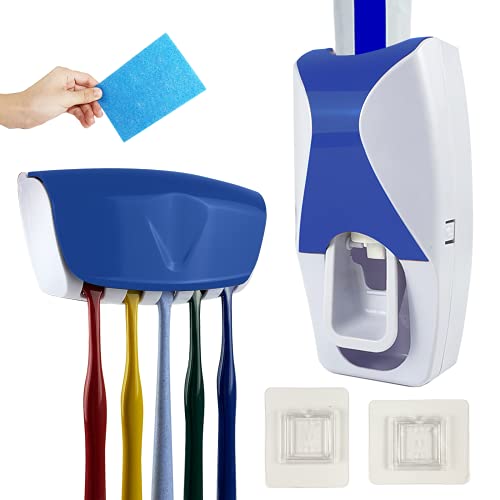 LOKiVE - حامل وموزع معجون الاسنان من لوكيف، ذاتي التركيب على الحائط مع حامل 5 من فرشاة الاسنان لحمام الاسرة (ازرق)