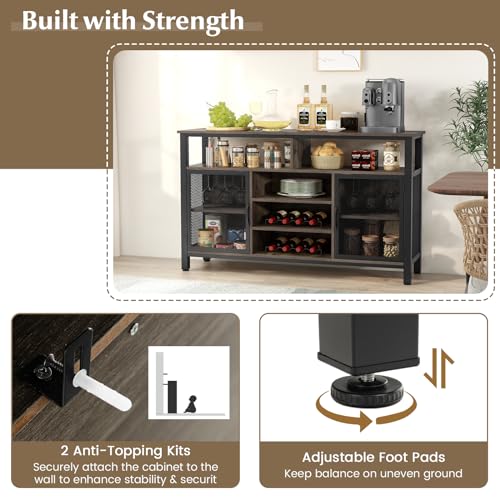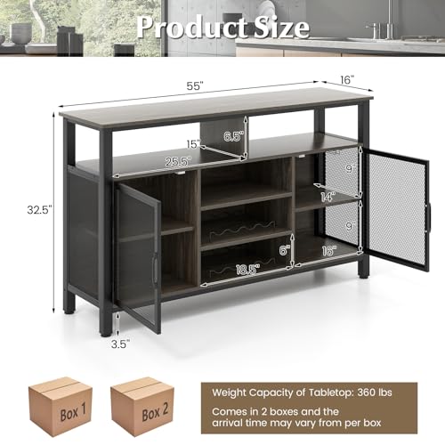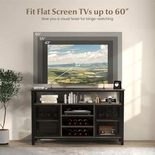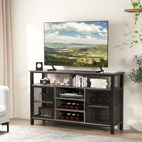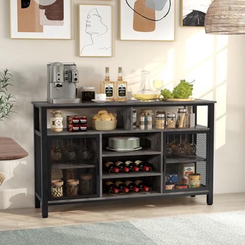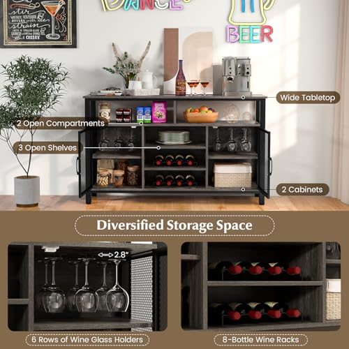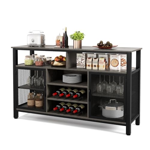 LOKO - خزانة بار مشروبات جانبية للمطبخ مع رف ب8 فتحات لزجاجات العصير وحوامل أكواب، خزانة قهوة بمساحة تخزين، وحامل تلفزيون لغرفة الطعام وغرفة المعيشة من لوكو (رمادي)
