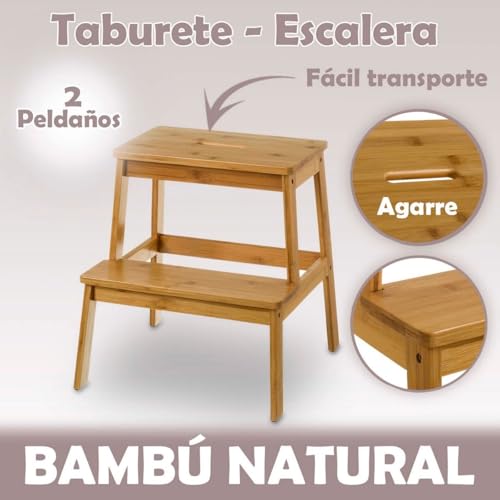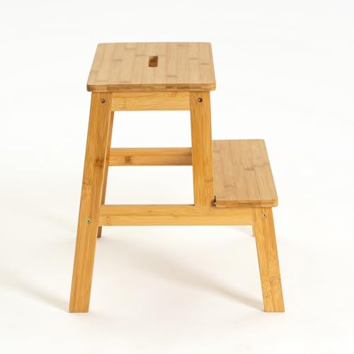 - مقعد سلم مصنوع من خشب الخيزران البني. مقعد بدرجتين ومقبض علوي للحمل.