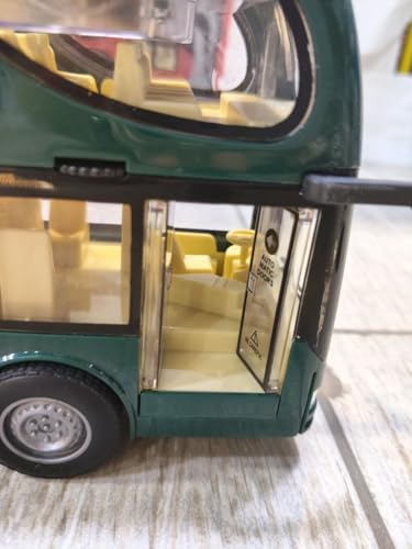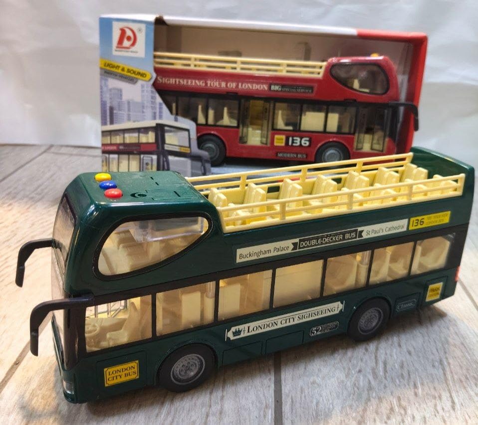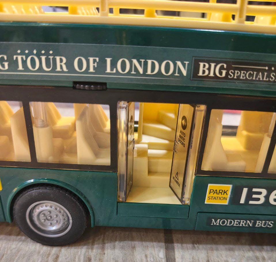 - حافلة لندن ذات الطابقين: نموذج مفصل لحافلة لندن الشهيرة ذات الطابقين باللون الأخضر مع تفاصيل واقعية وعلامات سياحية مثل قصر باكنغهام وكاتدرائية سانت بول