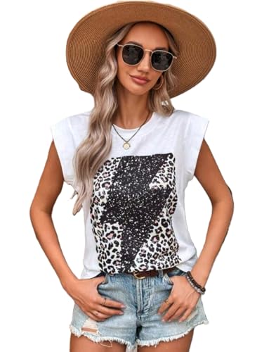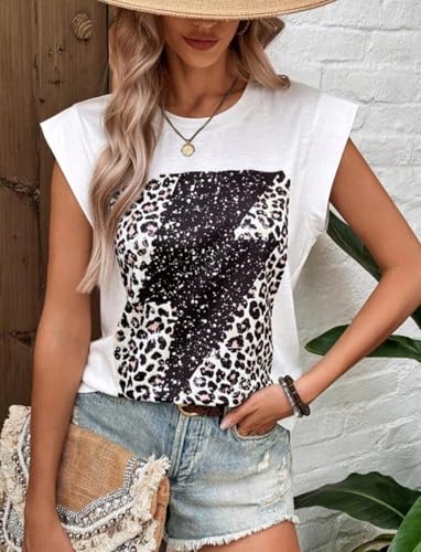 Generic - تي شيرت لونيه نسائي بقصّة عادية بدون أكمام ورقبة دائرية مع طبعة جلد النمر