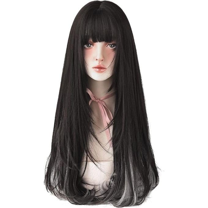 Generic - باروكة شعر مستعار طويل أسود بغرة، شعر مستقيم، ستايل ياباني، للنساء، للاستخدام اليومي والكوسبلاي
