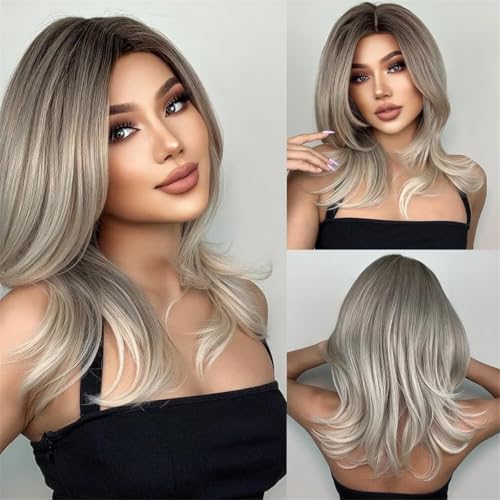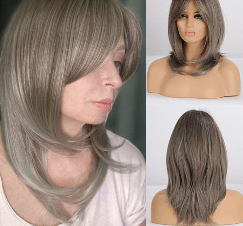 Generic - باروكة صناعية طويلة بدون فروة رأس بطول الكتف مع غرة كثافة 150% من ألياف صناعية مقاومة للحرارة طول الشعر 56 سم موديل JW 57-109/6، الأسود حتى الرمادي المتوسط مع لمسة زيتي
