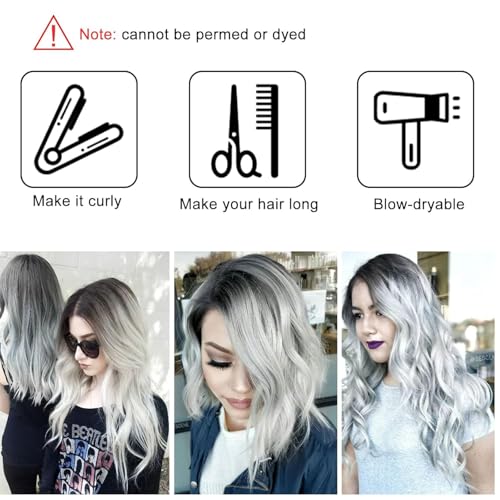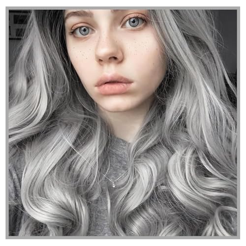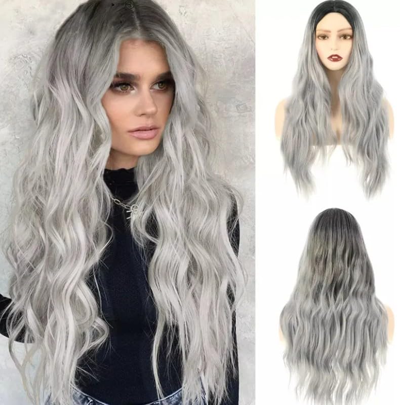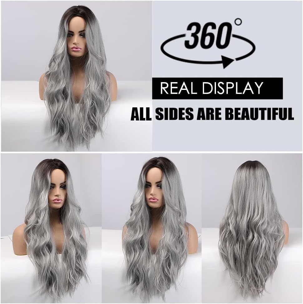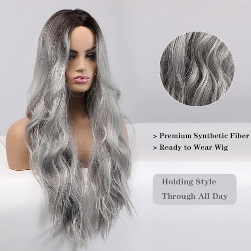 Generic - باروكة شعر مستعار صناعي طويل مموج بطول الكتف مع غرة بكثافة 150% موديل JW30-1، مصنوعة من الألياف الصناعية المقاومة للحرارة بطول 56 سم (من 65 إلى 70 سم)، جذور سوداء/فضية/رمادية