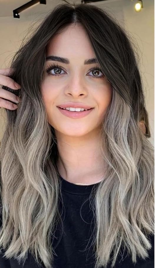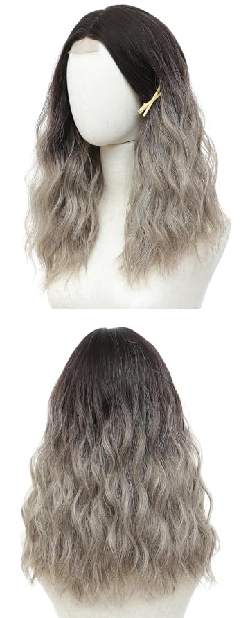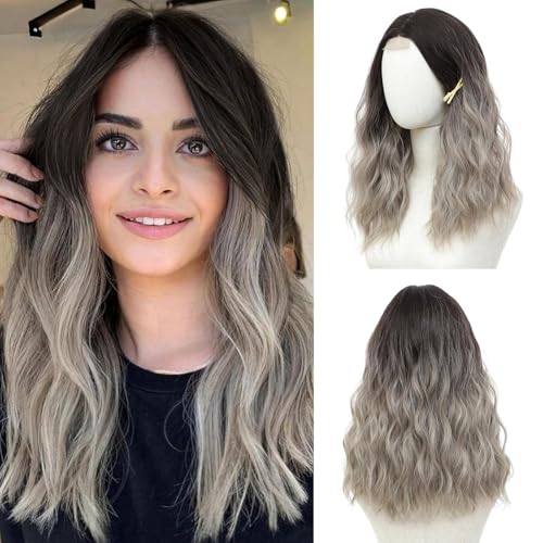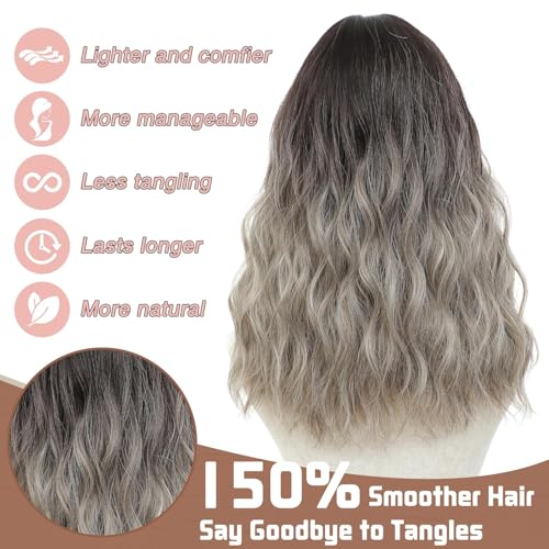 Generic - باروكة شعر مستعار صناعي طويل مموج بطول الكتف مع غرة بكثافة 150% من ألياف صناعية مقاومة للحرارة 50 سم حتى 55 سم - لون أسود إلى بني رمادي - JW73-109/6