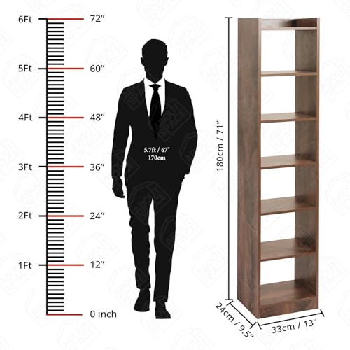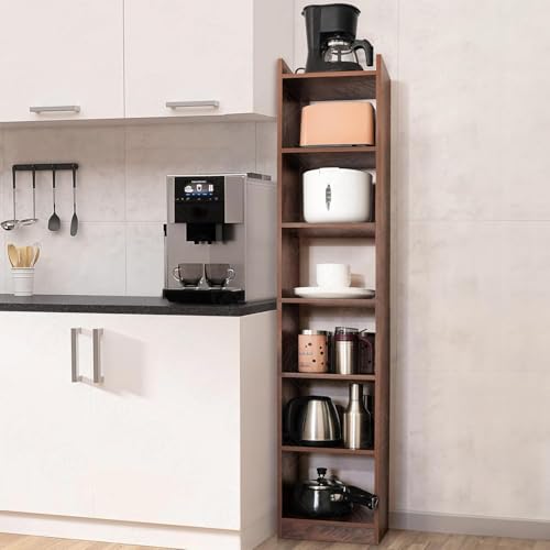 Generic - رف كتب طويل ضيق، خشبي بني، 6 أرفف، تصميم عمودي، لغرفة المعيشة والمكتب