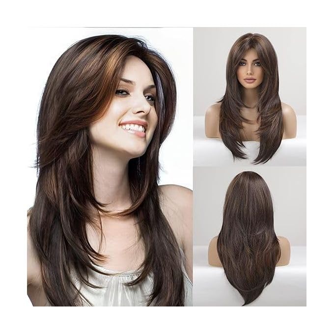 Generic - باروكة شعر طويل متدرج للنساء، بني غامق مع خصل بنية فاتحة، شعر مستعار طبيعي بطبقات