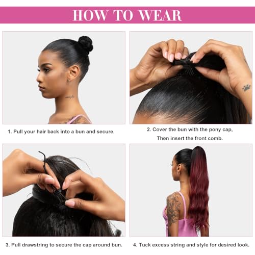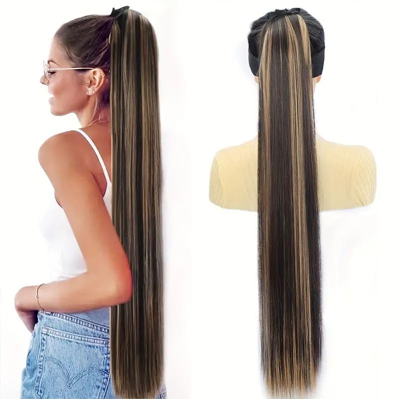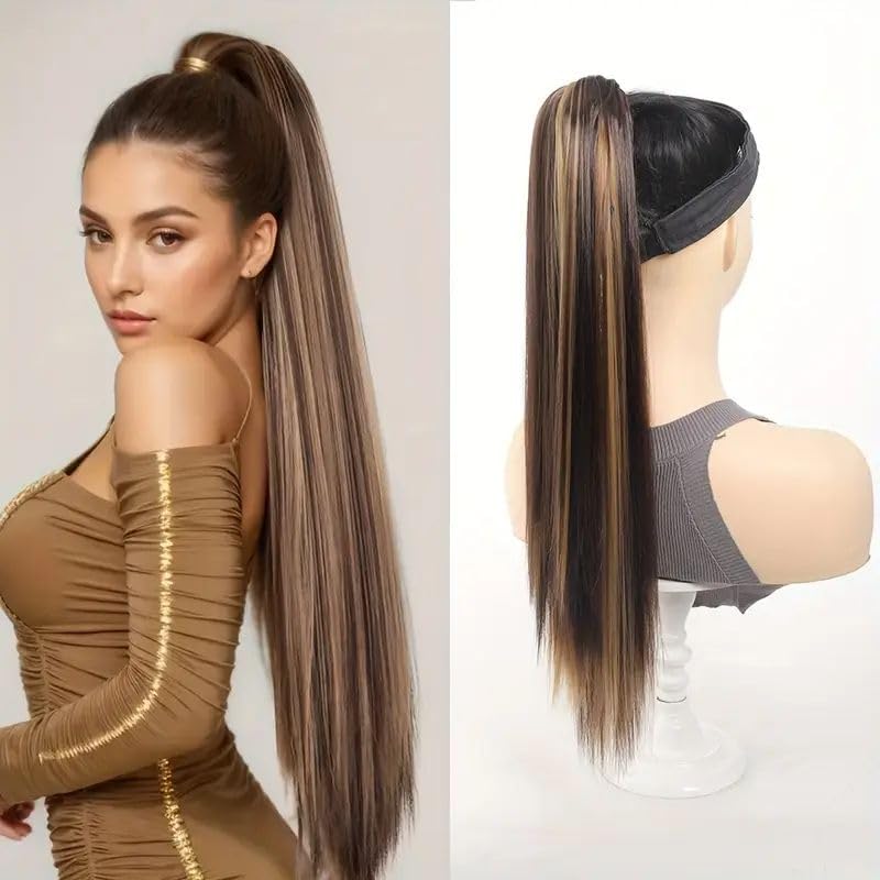 ECIF - وصلة شعر ذيل حصان طويل مع شداد قابل للتعديل، شعر مستعار صناعي بتصميم لف حول القاعدة للتركيب السريع والمظهر الطبيعي (بني مخصل)