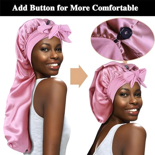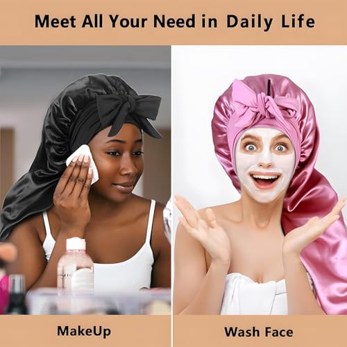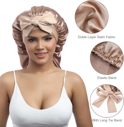 بونيه طويل من الساتان للنساء الترند حرير مرن مزدوج الطبقات مع رباط ربط اربطة قابلة للتعديل مقاس جامبو قبعة استحمام حريرية للشعر الطويل والضفائر والشعر المجعد الوان مختلفه