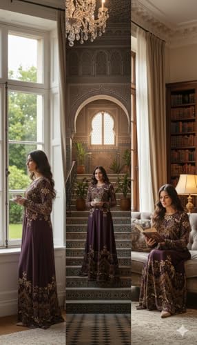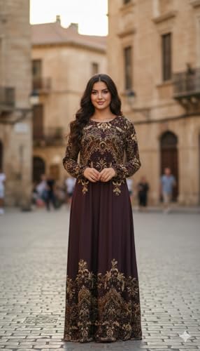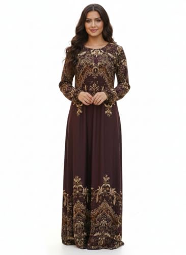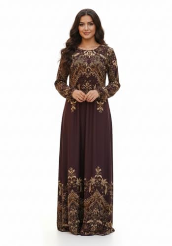 Generic - فستان ماكسي بأكمام طويلة، بنفسجي، بنقشة زهرية ذهبية، تصميم عتيق أنيق