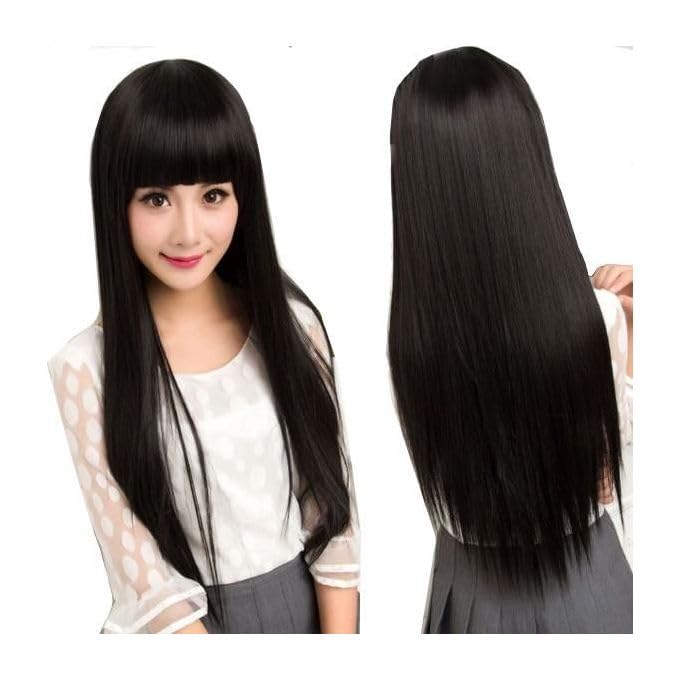 Generic - باروكة شعر مستقيم طويل بغرة، أسود، شعر صناعي، طول كامل، ستايل آسيوي