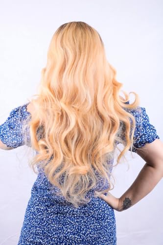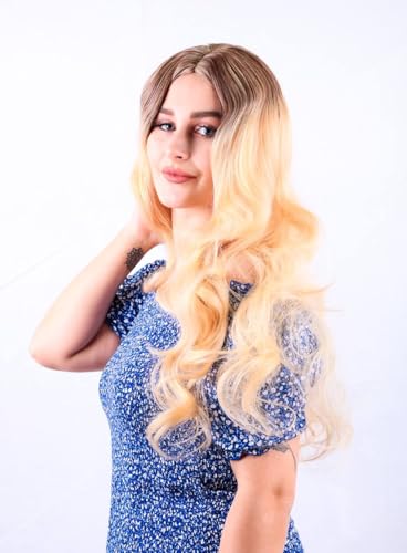 Generic - باروكة صناعية طويلة مموجة بلون أشقر مع جذور داكنة، مقاومة للحرارة، مظهر طبيعي