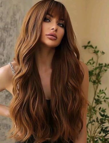 DILLARDS - شعر مستعار صناعي طويل مموج بني بغرة ومصنوع من فايبر مقاوم للحرارة بمظهر طبيعي للحفلات التنكرية والارتداء اليومي