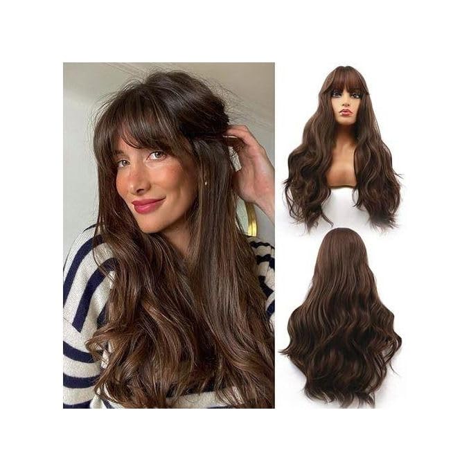 Generic - باروكة شعر طويل مموج بني مع غرة، شعر مستعار نسائي صناعي بطول كامل، تصفيفة عصرية طبيعية
