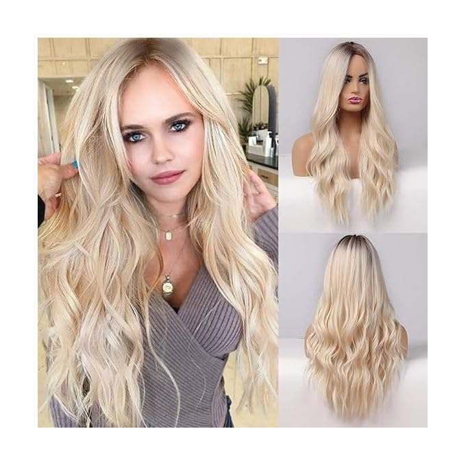 Generic - باروكة شعر مستعار طويل مموج، لون أشقر بجذور داكنة، شعر صناعي بمظهر طبيعي للنساء
