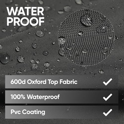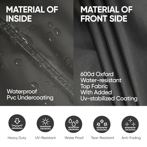 - مقاوم للماء: قماش علوي من قماش اوكسفورد بكثافة 600 دينيير عالي التحمل مقاوم للماء بنسبة 100% مع طلاء إضافي مثبت بالأشعة فوق البنفسجية وطلاء سفلي مقاوم للماء مصنوع لحماية غطاء أثاث الفناء الخاص بك من التلف الطبيعي والعناصر الخارجية مثل الشمس والأوساخ والمطر والثلج.