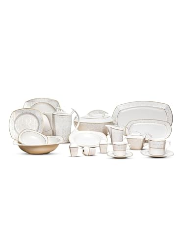 Lotus - طقم عشاء ليزبون من البورسلين من لوتس، موديل 1003215، 62 قطعة، لون أبيض