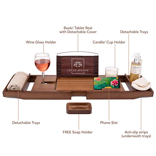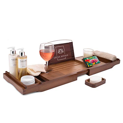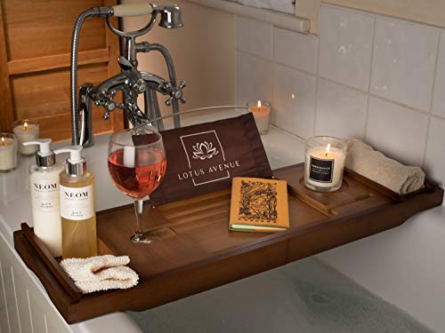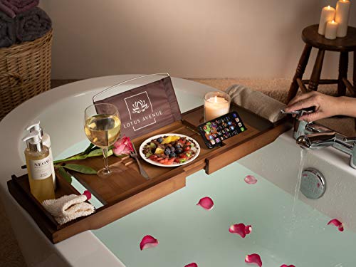 Lotus Avenue - صينية قابلة للتوسيع من خشب الخيزران مع حامل مشروبات وكتب وايباد وشموع وملحقات موبايل للاستحمام والمنتجعات الصحية من لوتس افينيو