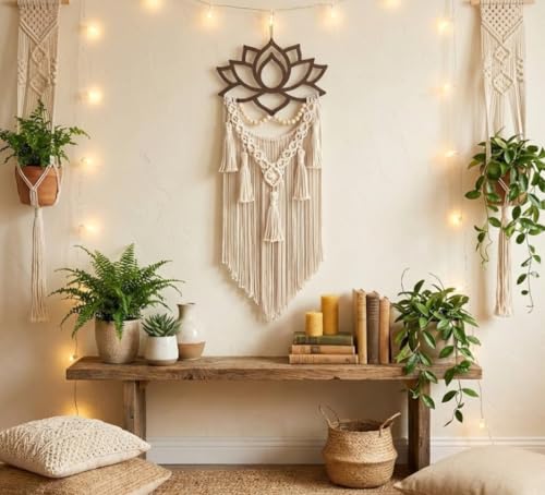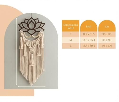 - عناصر التصميم: مكرمية جميلة للتعليق على الحائط تتميز بإطار من خشب ليفي متوسط الكثافة بنقش زهرة اللوتس، ونقوش معقدة من حبال القطن مع لمسات من الخرز وشرابات أنيقة.
