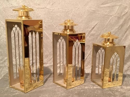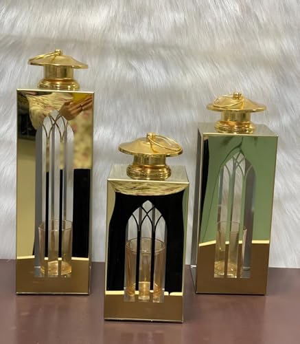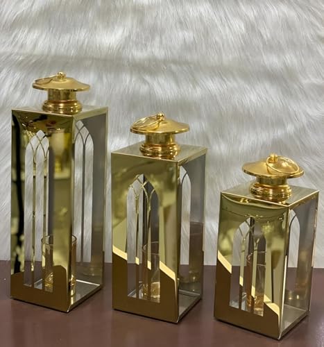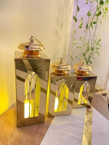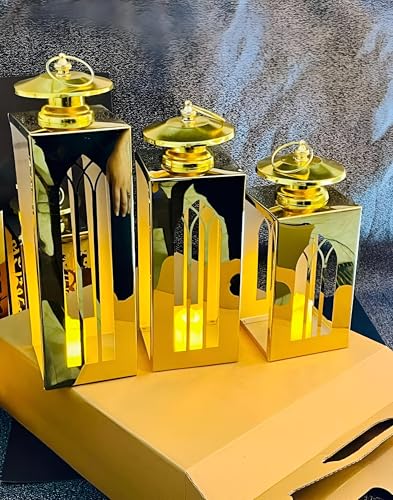 - تتميز هذه المجموعة بثلاثة فوانيس مزخرفة مصنوعة من الستانلس ستيل المتين باللون الذهبي مع لمسات عاكسة، مما يضيف لمسة فاخرة إلى أي مساحة ويزيد من الجمال العام للديكور الاحتفالي أو اليومي.