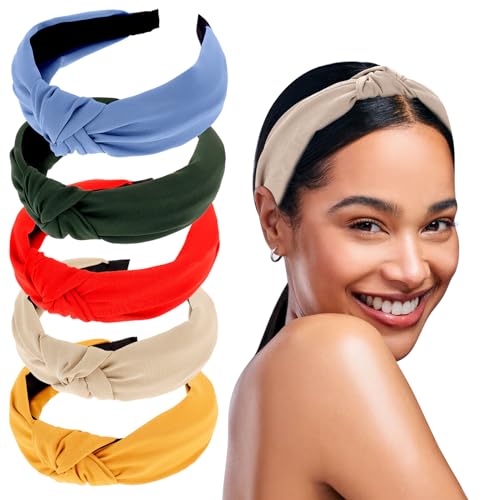 loucent - 5 قطع من عصابات الرأس المعقودة للنساء من لوسينت - شريط راس عريض غير قابل للانزلاق لاكسسوارات الشعر الانيقة - اخضر عسكري وازرق سماوي