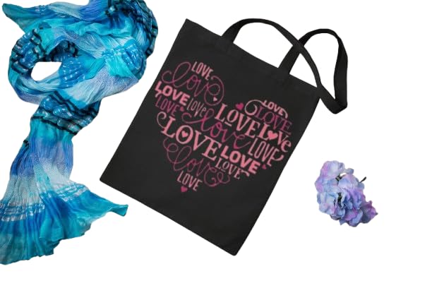 Generic - شنطة يد كبيرة توت قماشية بطبعة قلب الحب، اسود مع طباعة وردية، شنطة تسوق قابلة لاعادة الاستخدام