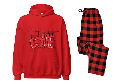 Generic - طقم بيجامة بغطاء للرأس وبنطلون كاروهات بنمط الحب، احمر واسود، مقاس (2XL)