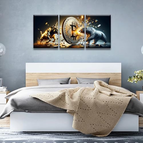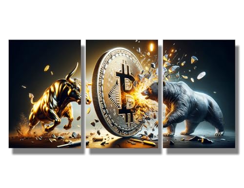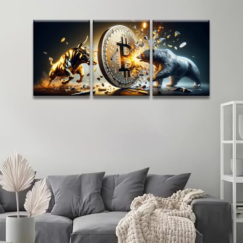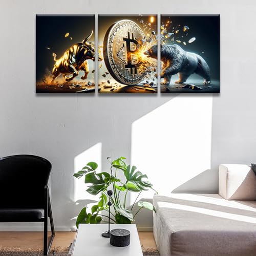 LSIUHWUWI - لوحة حائط فنية قماشية بتصميم ثور بلون ذهبي مقابل دب بلون فضي مع بيتكوين ديكور عصري للمكتب أو غرفة المعيشة من ال سيو هووي، مقاس 30× 40× 3 قطع، عبوة من 3 قطع