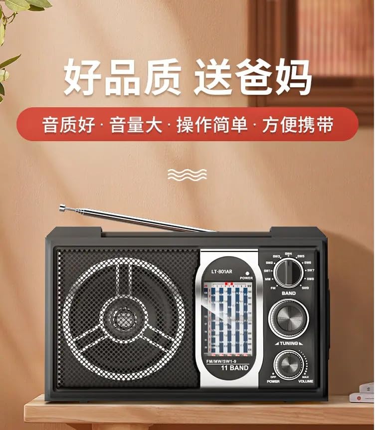 Generic - راديو محمول 11 نطاق LT-2008 مع تشغيل مزدوج AC/DC، حساسية عالية، ويد حامل، مدخل سماعات – أسود